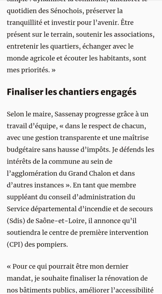 Je suis convaincu que Sassenay avance grâce au travail d’équipe, dans le respect de chacun et sans intérêt personnel, les élus d’opposition nous ayant même rejoint dans ce mandat. Le bon sens, la transparence et l’écoute guident mon action pour un réel développement et un véritable bien-vivre ensemble, avec une maitrise budgétaire, sans hausse d’impôts depuis de nombreuses années.