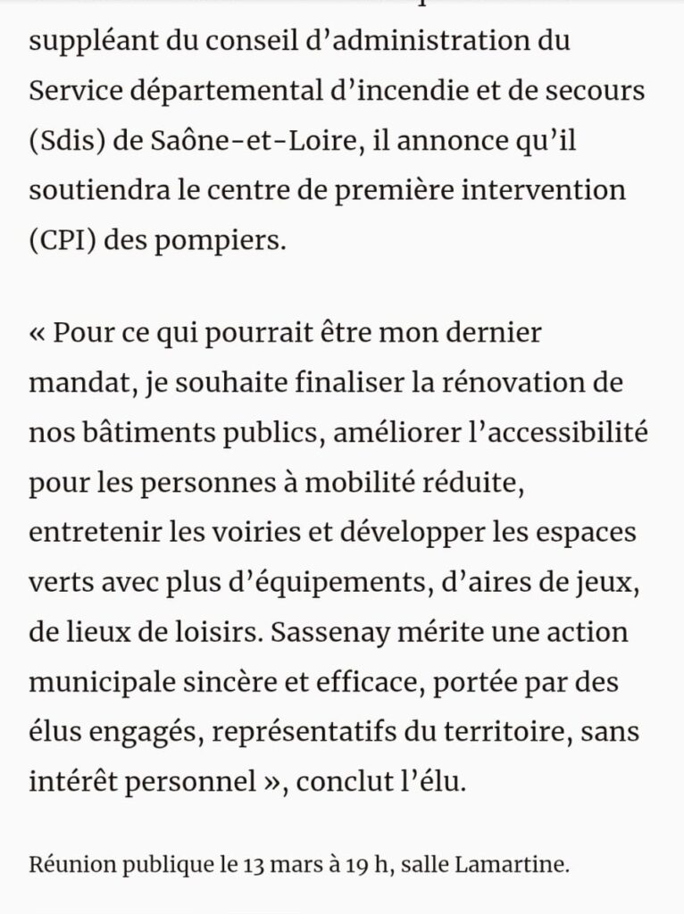 « Maire sortant de Sassenay, âgé de 60 ans, marié, père de 3 enfants, grand-père de deux petits-enfants, je suis profondément implanté et attaché à Sassenay depuis 33 ans.