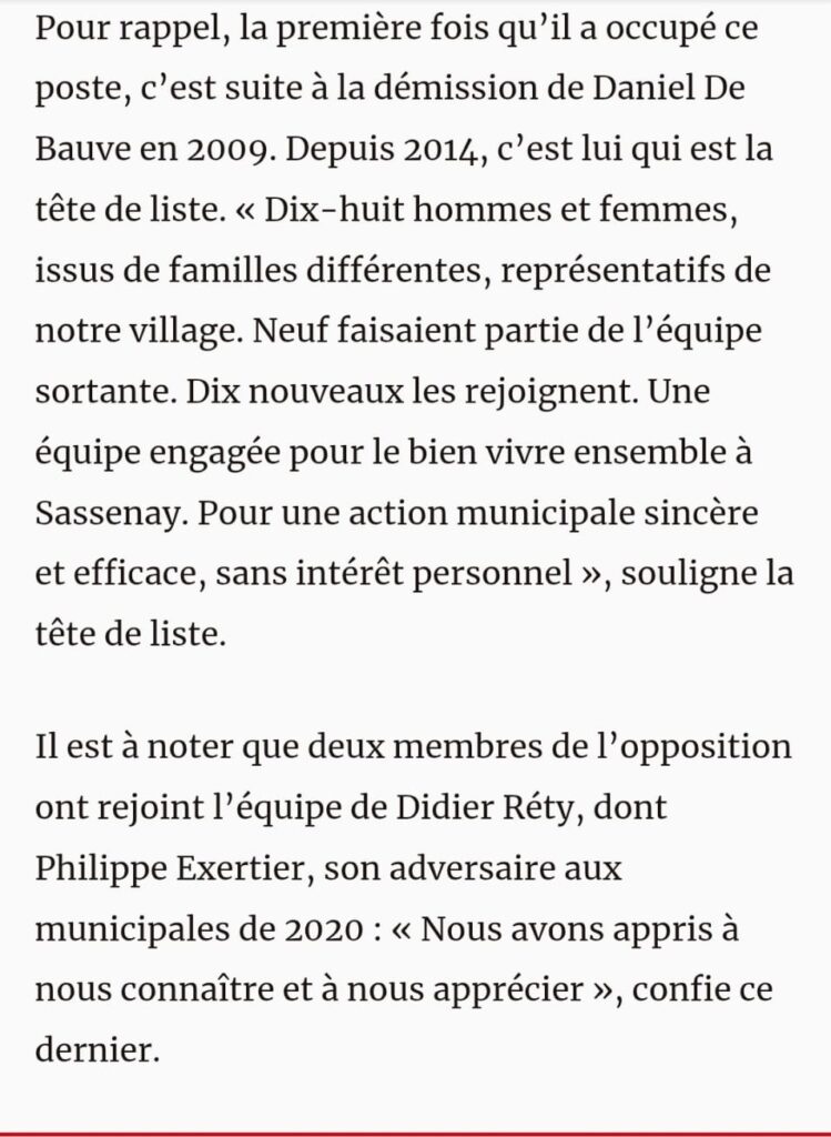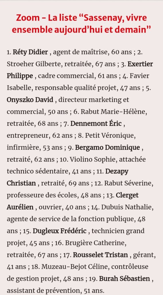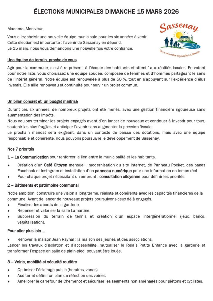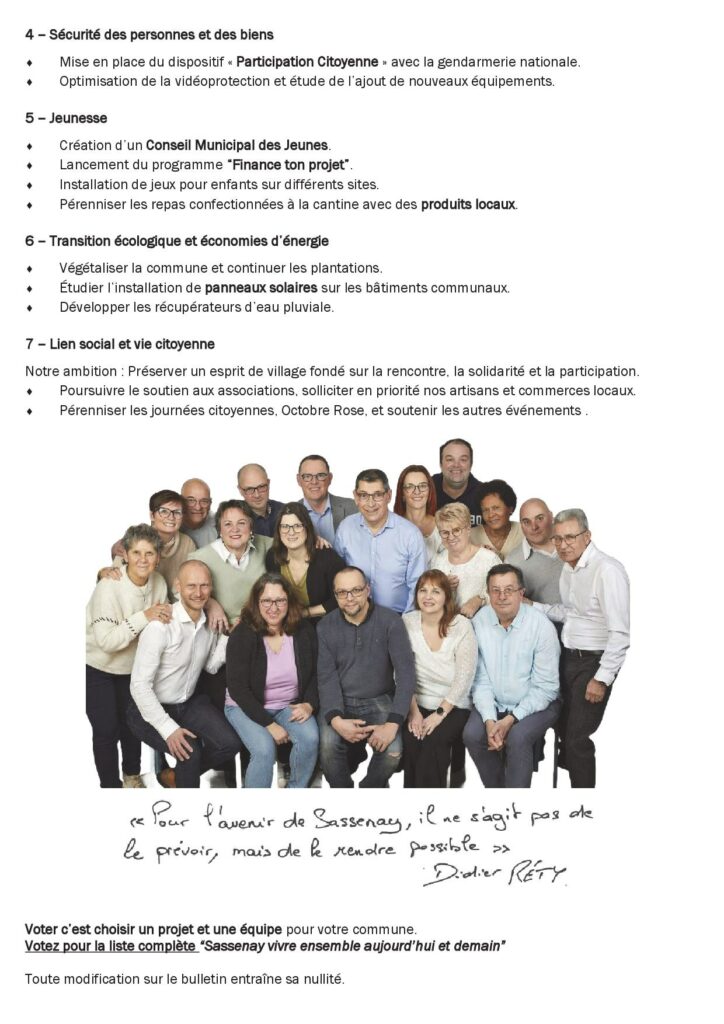 Sassenay mérite une action municipale de proximité, sincère et efficace, portée par 19 élus municipaux issus de familles différentes et représentatives de notre village, implantés dans les divers quartiers de la commune et inscrits depuis longtemps sur les listes électorales, preuve de leur attachement au territoire et de leur engagement collectif, sans intérêt personnel. »